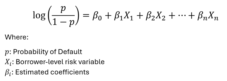 Mathematically, the model estimates the log-odds of default as a linear combination of explanatory variables: