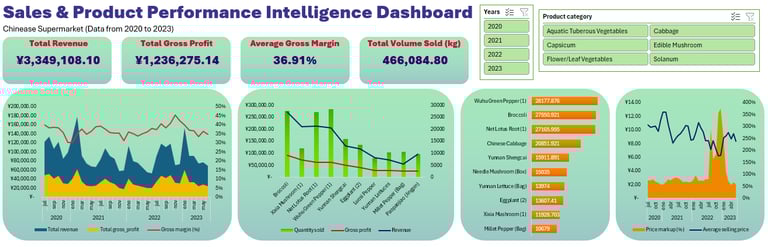 Through a structured dashboard combining KPIs, time-series margin analysis, product-level profitability, and pricing dynamics, the project uncovers how revenue, gross profit, and markup evolved over time