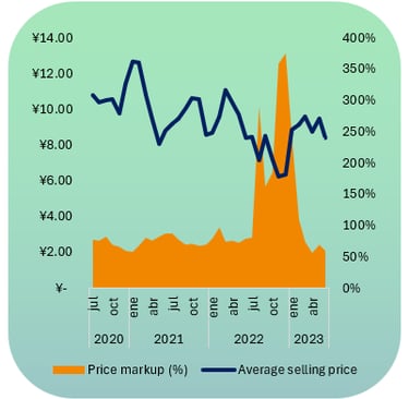 The period of significant markup increase (Jul 2022 – Jan 2023) coincides with the highest gross margin period.